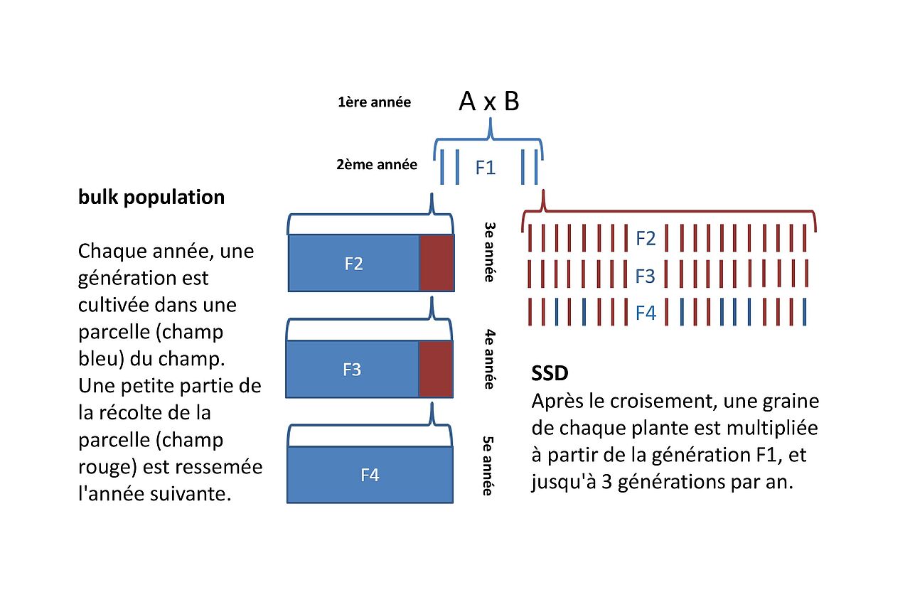 La méthode Single Seed Descent permet d'augmenter la vitesse du processus de sélection et la traçabilité dans les premières étapes de la sélection. Alors que dans le système de bulk populations, il est impossible de savoir de quelle plante provient quelle graine, dans le Single Seed Descent, une graine par plante est récoltée à partir de la deuxième génération et replantée. Pour cela, les plantes sont cultivées individuellement jusqu'à ce qu'une ou deux gousses soient complètement formées et mûres. Elles sont ensuite récoltées et réensemencées. Ce procédé a été mis en œuvre ces deux dernières années dans des serres chez Sativa et dans la ferme biologique de la famille Itin à Ormalingen (BL).