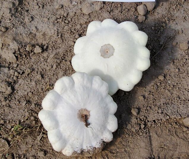 Der weisse UFO-Kürbis, auch bekannt als Patisson, produziert ähnlich wie Zucchini immer wieder neue Früchte. Er ist diskusförmig (daher der Name) und wird geerntet, wenn er noch jung und die Schale noch weich ist. Er stammt ursprünglich aus Amerika.