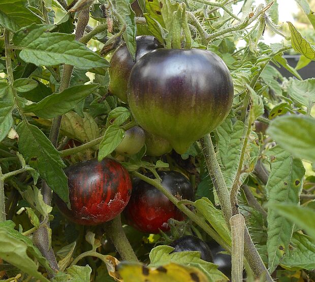 Bei den Tomaten werden vor allem Sorten mit schwarzer Auberginenhaut ausgewählt, eine Spezialität von Stefan Griesser. Auch bei der Farbe des Fleisches, die von weiss bis braun, von gelb über rot bis grün reichen kann, wird auf Massarbeit gesetzt. Bei einigen Versuchen gelingt es, gleichzeitig die schwarze Farbe und das Zebramuster der Haut sichtbar zu machen.