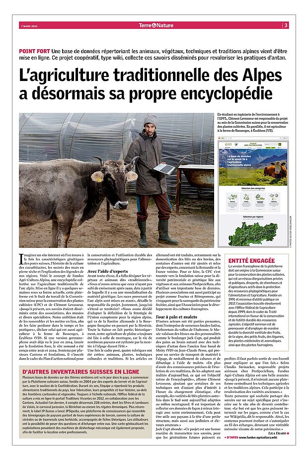 Ziel des Projekts ist es, ein Höchstmass an Wissen über kultivierte Pflanzensorten, Tierrassen, Anbautechniken und Traditionen im gesamten Alpenraum zu erfassen. Auf der Plattform Fundus Agri-Cultura Alpina wurden Artikel veröffentlicht: 278 französische Texte wurden online gestellt und 47 Übersetzungen aus dem Deutschen wurden ebenfalls erstellt (Stand 31.12.2023). Diese Arbeit wäre ohne die Arbeit der Freiwilligen und Mitarbeiterinnen des BNF-Programms, für die wir uns herzlich bedanken, nicht möglich gewesen. Die Artikel behandeln Themen, die so vielfältig sind wie die Obst- und Weinsorten der Westschweiz, die Schafrassen der französischen Alpen, die Geschichte des Getreides im Alpenraum, der Anbau von Lavendel, die Verbindung zwischen der Bewirtschaftung und der Biodiversität der Wiesen, die Gemeindeöfen und das Freiburger Fest der Bénichon behandelt. Auf der anderen Seite wurden auf der Plattform verschiedene grosse Anpassungen vorgenommen, mit dem Hauptziel, sie konform und vor allem einfach für die Nutzer:innen zu machen.