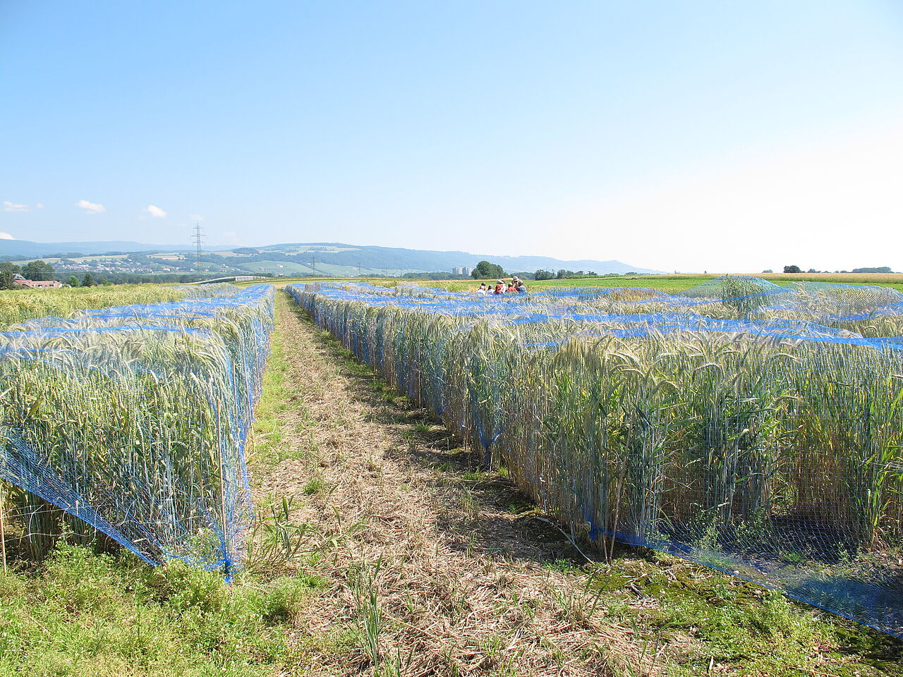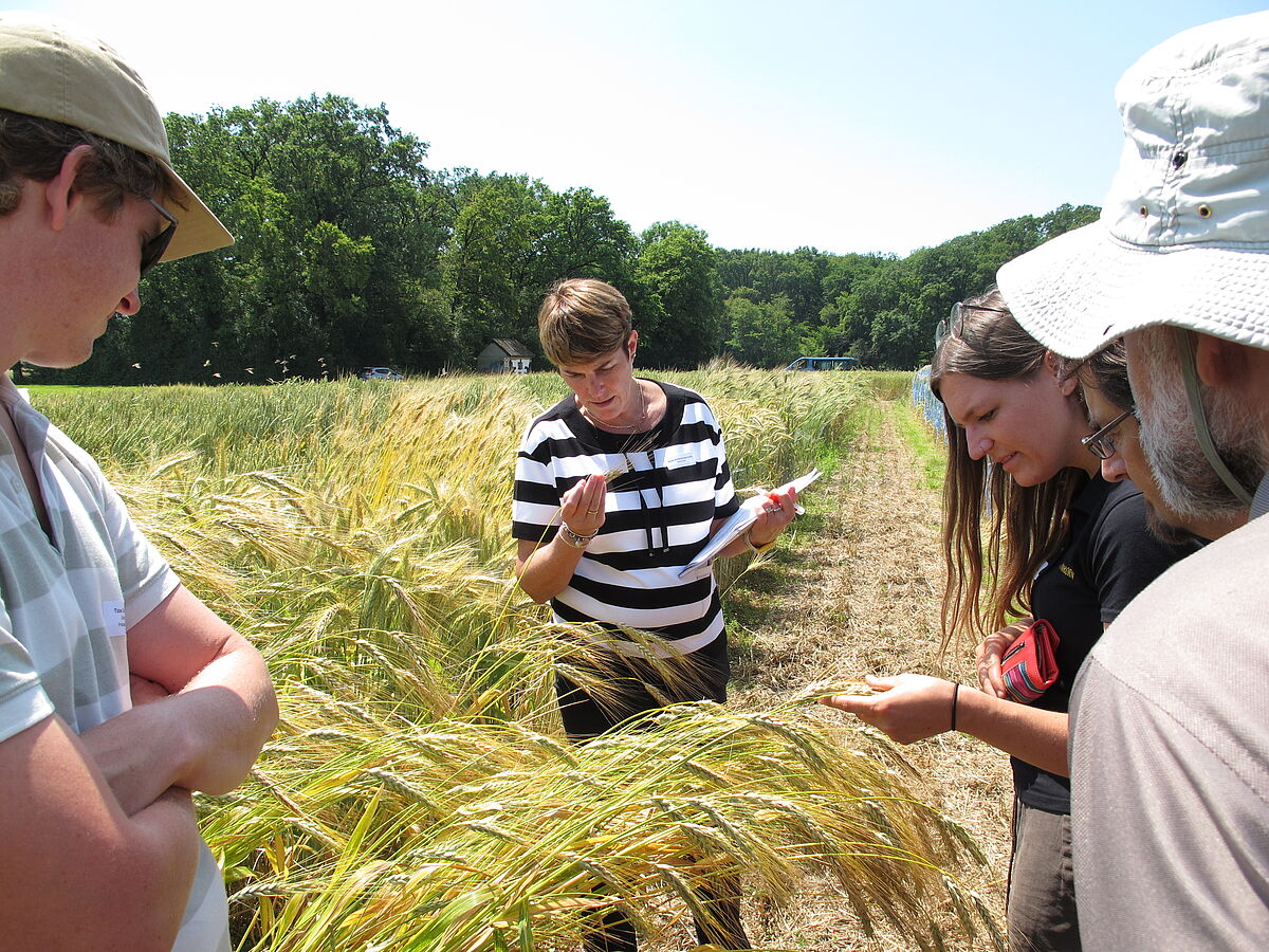 Anschliessend führten Beate Schierscher und Cyril Schnewlin von der Nationalen Genbank die Teilnehmenden aufs Feld, wo jedes Jahr über 1000 Akzessionen für die Getreidesammlung vermehrt werden. Auf Miniparzellen werden von jeder Akzession 500 Gramm Saatgut gewonnen, wobei die Ernte von Hand erfolgt. Auf dem Rundgang lernten die Teilnehmenden alte Züchtungslinien kennen, die vor über hundert Jahren angebaut wurden oder auch die Sorte «Probus», die in den 1960er-Jahren über 90 Prozent der Getreidefläche belegte. Sie begegneten auch dem Macha-Weizen, einem Urweizen, den es ohne die Erhaltung durch Genbanken nicht mehr geben würde.