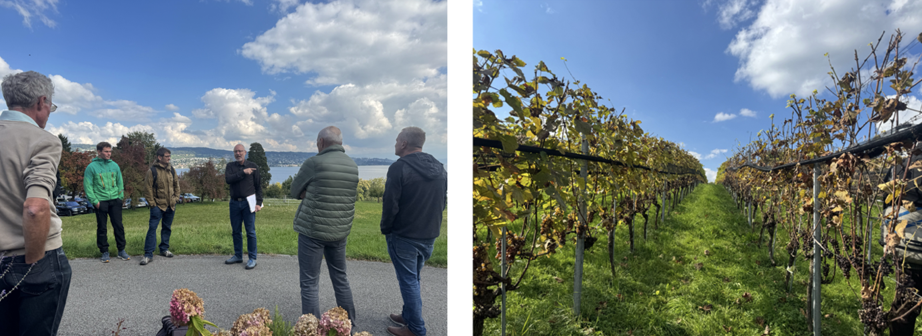 Die Teilnehmenden besichtigten anschliessend den Sortengarten der Rebsorten der ZHAW, einen Sortengarten, der den Geist des Nationalen Aktionsplans für die Erhaltung der Nutzpflanzenvielfalt anschaulich widerspiegelt. Dort finden sich traditionelle Schweizer Rebsorten wie Räuschling oder Müller-Thurgau, moderne pilzwiderstandsfähige Sorten, aber auch Wildreben (Vitis vinifera sylvestris). Der Garten ermöglicht einen Vergleich der Rebsorten hinsichtlich Herkunft, Geschichte und Eigenschaften und dient sowohl der Forschung als auch der Ausbildung, da Lernende und Studierende des Weinbaus ihn regelmässig besuchen.