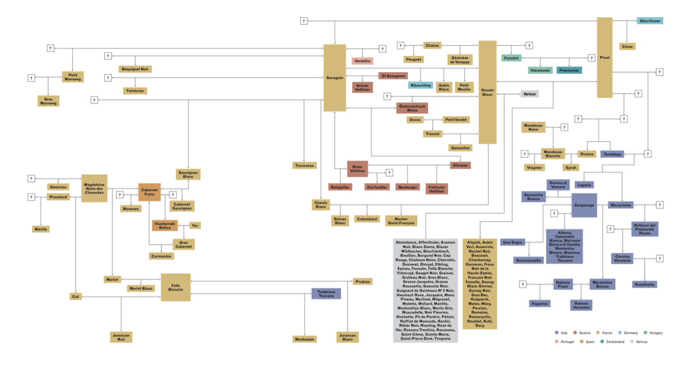 Peter Schumacher stellte zudem den Stammbaum der Rebsorten vor, der die zentrale Bedeutung von drei historischen Sorten verdeutlicht: Savagnin blanc (Traminer), Pinot noir (sowie seine Mutationen Pinot gris und Pinot blanc) und Gouais blanc (Heunisch weiss). Letzterer wird mitunter als der „Casanova des Weins“ bezeichnet, da er seine Gene besonders häufig weitervererbt hat: Er ist der Ursprung bedeutender Sorten wie Chardonnay, Gamay, Aligoté oder Auxerrois. Der Savagnin wiederum ist durch Mutation der Ursprung des Gewürztraminers, während auch der Pinot zahlreiche weitere Linien hervorgebracht hat.