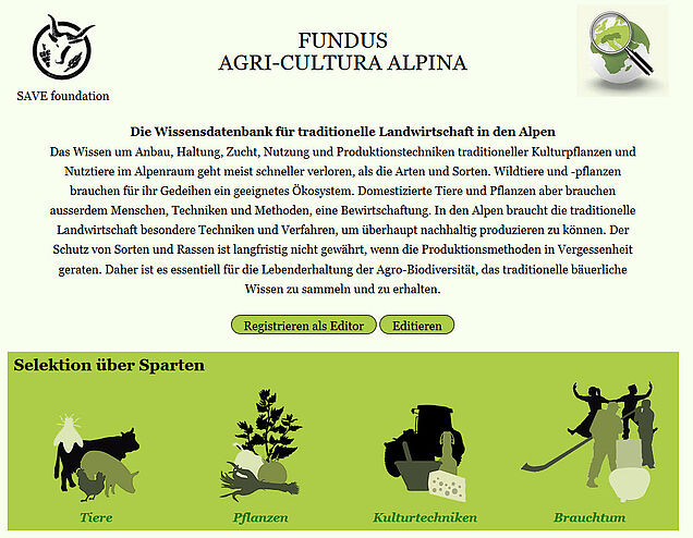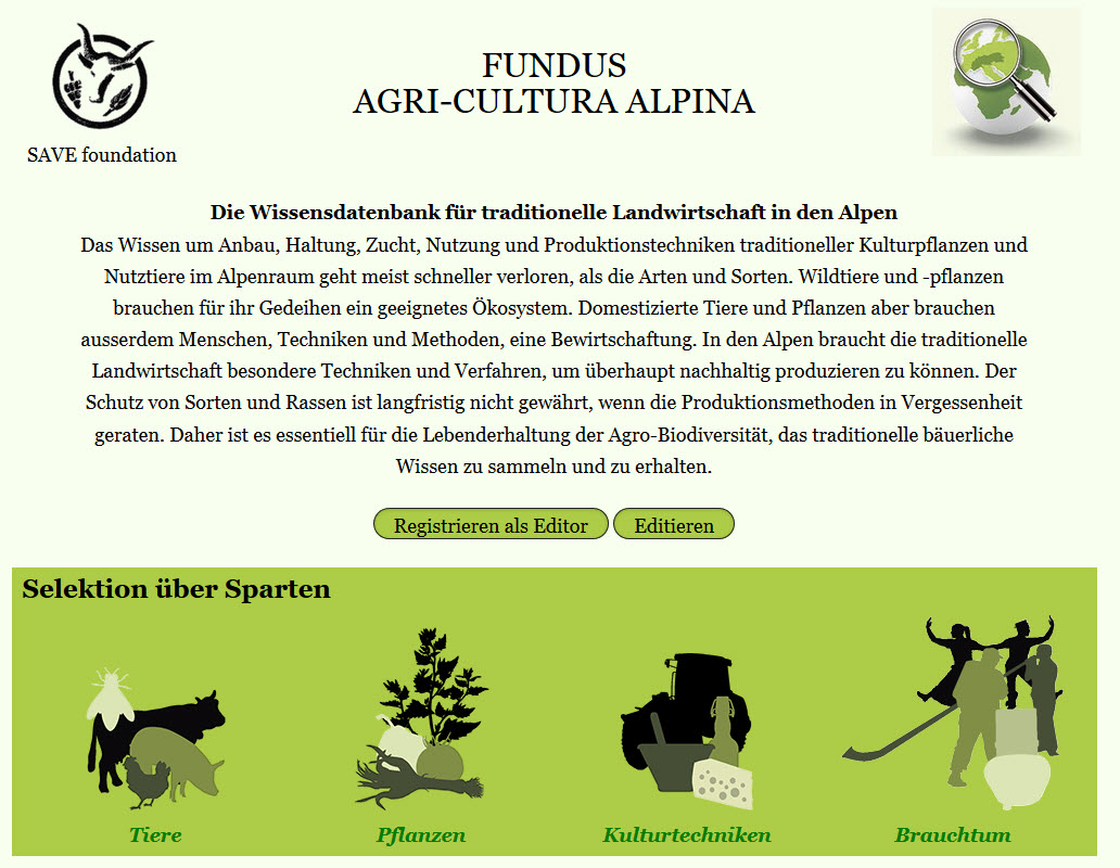 Anleitung: um teilzunehmen müssen Sie sich auf der Website www.fundus-agricultura.wiki für eine oder mehrere Kategorien (Tiere, Pflanzen, Pflanzenanbau, Traditionen) anmelden. Anschliessend erhalten Sie ein Passwort. Das Büro des SAVE-Projekts beantwortet alle Ihre Fragen: office(at)save-foundation.net, +41 71 222 74 10