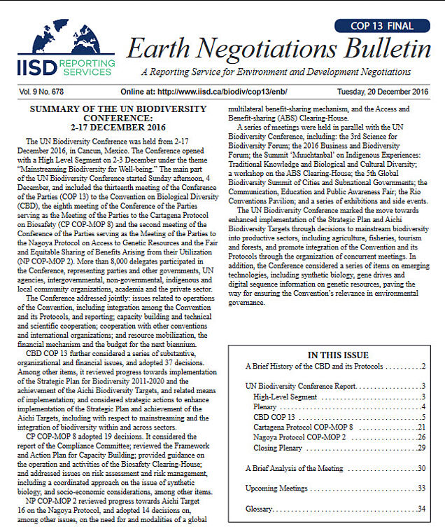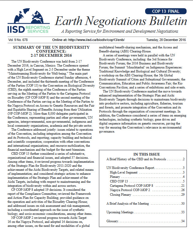 Die 13. Konferenz der Vertragsparteien der Konvention über die biologische Vielfalt (CBD) fand vom 4. Bis zum 17. Dezember in Cancun, Mexiko statt mit Repräsentanten von 176 Parteien (von insgesamt 196) und 8000 Abgeordneten aus dem privaten Bereich, von autochtonen oder lokalen Gemeinschaften, dem NRO etc. Etwa vierzig Beschlüsse wurden angenommen, die darauf abzielen:
