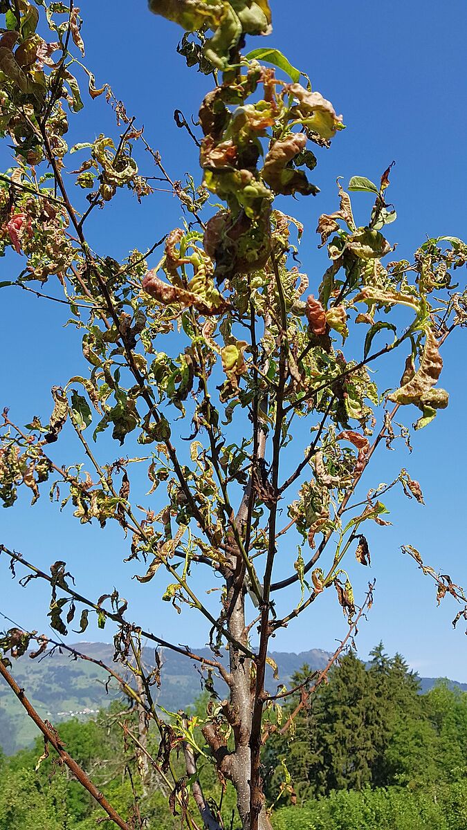 Die Belastung von Nahrungsmitteln und der Umwelt mit chemisch-synthetischen Pestiziden ist auch bei uns in Europa und der Schweiz ein grosses Thema. Der Druck der Bevölkerung und der Politik steigt, den Einsatz von Pestiziden drastisch zu senken. Weniger anfällige Sorten sind der Schlüssel, um den Pestizideinsatz zu senken, darin sind sich die Fachleute einig. Schon heute werden gewisse neue Nektarinen- und Pfirsichsorten als sehr gesund, d. h. als wenig krankheitsanfällig angeboten. Wie das Beispiel der neuen, für den Erwerbsanbau empfohlenen Sorte ‘Sehrgesund’ (Name vom Autor geändert) zeigt, öffnet sich eine Schere zwischen Werbung und Praxis. Der Baum der Sorte ‘Sehrgesund’ wird in der Werbung als sehr gesund angepriesen (siehe Bild 1), Zitat: «…Der Baum wächst sehr gesund und stark…». Dieselbe Sorte im Praxistest in Scharans ohne Einsatz von Pflanzenschutzmitteln (siehe Bild 2): Der ausserordentlich starke Befall durch die Kräuselkrankheit (Taphrina deformans) führte zum Absterben des ganzen Baums.