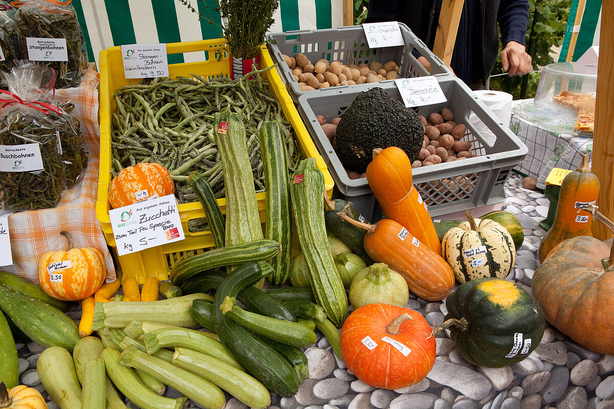 Die Landwirtschafts- und Alpwirtschaftsflächen machen zusammen mehr als einen Drittel der Gesamtfläche der Schweiz aus. Betrachtet man die offene Ackerfläche ein wenig genauer so stellt man fest, dass das Getreide an erster Stelle liegt, gefolgt von den Kartoffeln und Rüben, und den Ölsaaten. Die Obstkulturen und Weinberge haben einen ähnlichen Flächenanteil wie die Ölsaaten. Und wie sieht die Statistik beim Konsum aus? Hier liegen die Früchte an erster Stelle, ein grosser Anteil der Früchte wird importiert. Die Zahlen aus dem Jahr 2012, welche im 2015 publiziert wurden zeigen ausserdem, dass eine Person in der Schweiz im Schnitt 870 kg Nahrungsmittel in einem Jahr zu sich nimmt, davon sind 540 kg pflanzlicher Herkunft, unter anderem 125 kg Früchte, 105 kg Gemüse, 90 kg Getreide, 50 kg Kartoffeln, 10 kg Leguminosen, Nüsse und Kastanien.